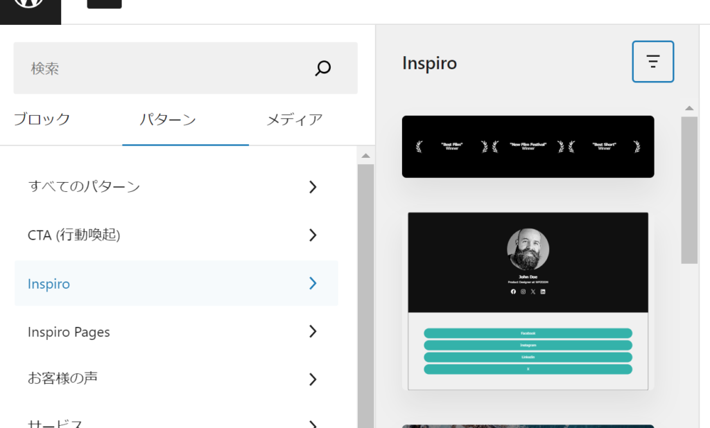 「キュレーション済」の項目をクリックすると「コミュニティ」に切り替えることができます。「キュレーション済」はWordPress公式が作成したパターンのようですが、「コミュニティ」に切り替えると世界中のユーザーから投稿されたパターンから探すことができます。