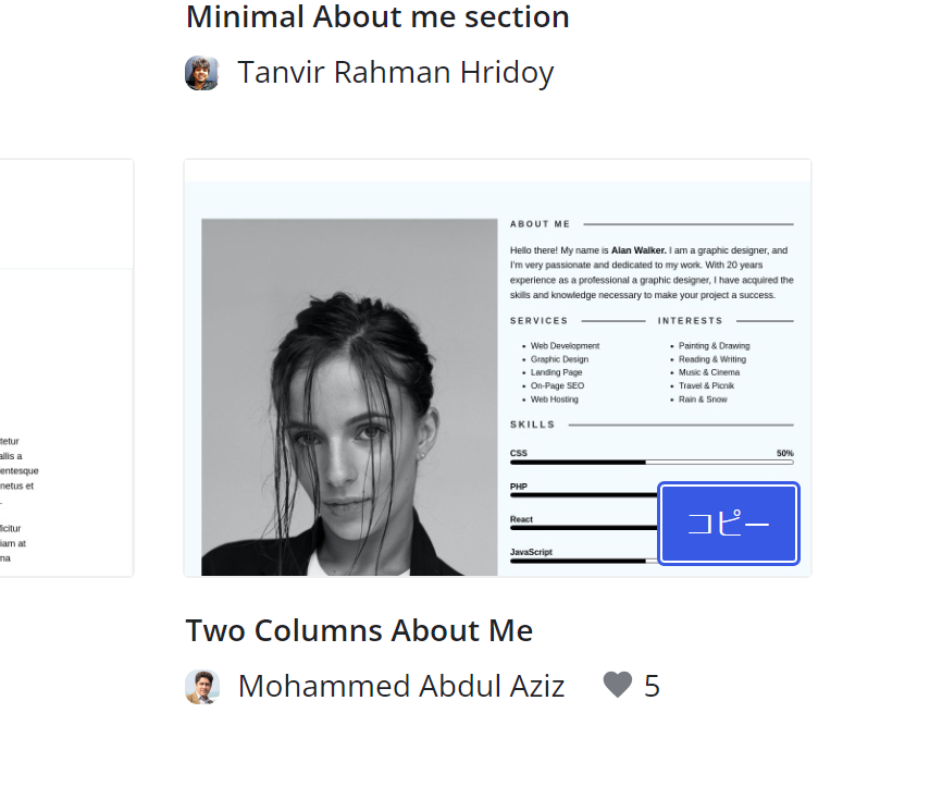 Mohammed Abdul Azizさんの「Two Columns About Me」が気に入ったので、これを使おうと思います。カーソルを乗せると「コピー」というボタンが出てくるのでクリックします。