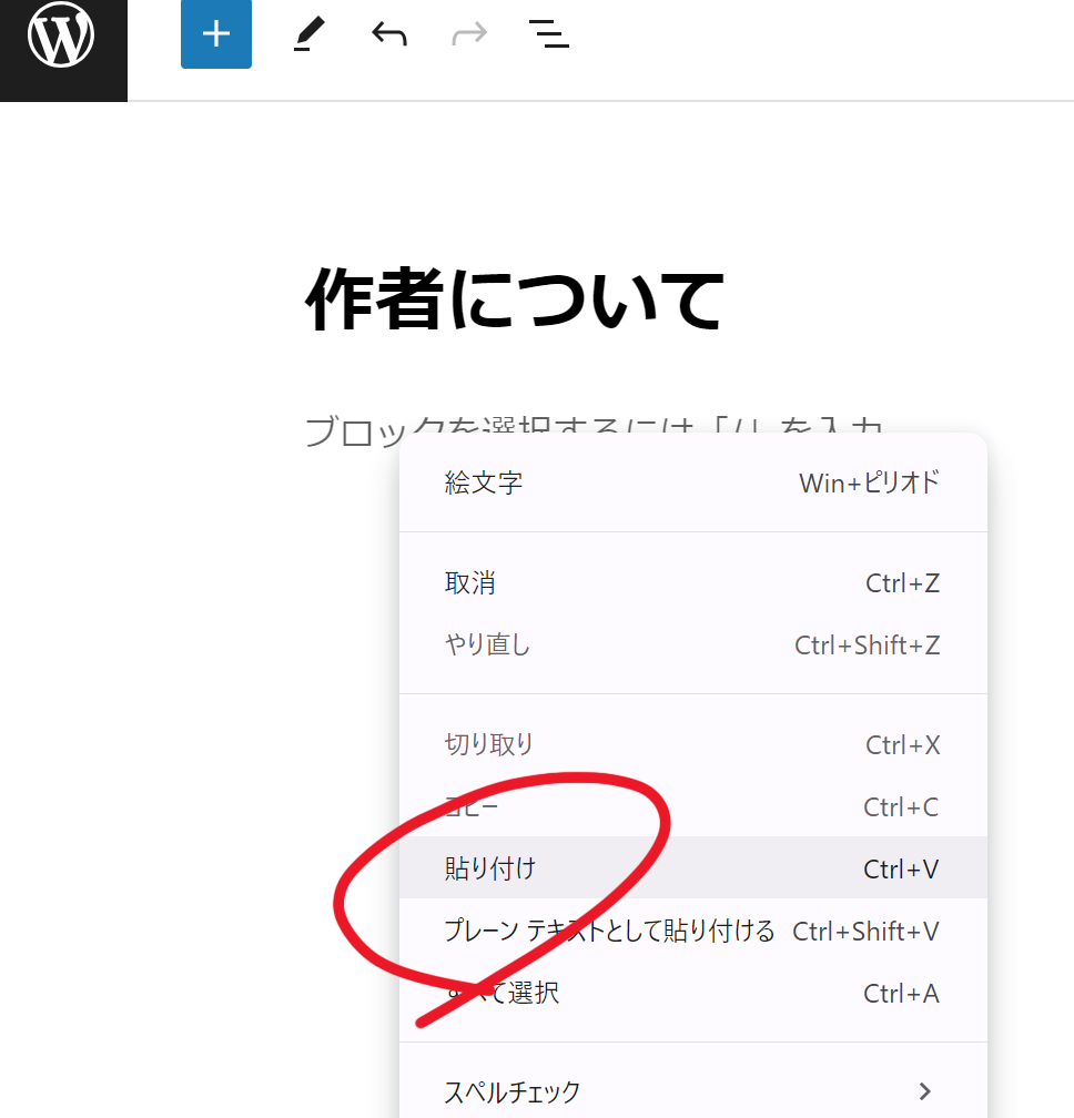 では自己紹介用のページに戻り、本文のあたりをクリックしてから右クリックメニューの「貼り付け」を選びます。