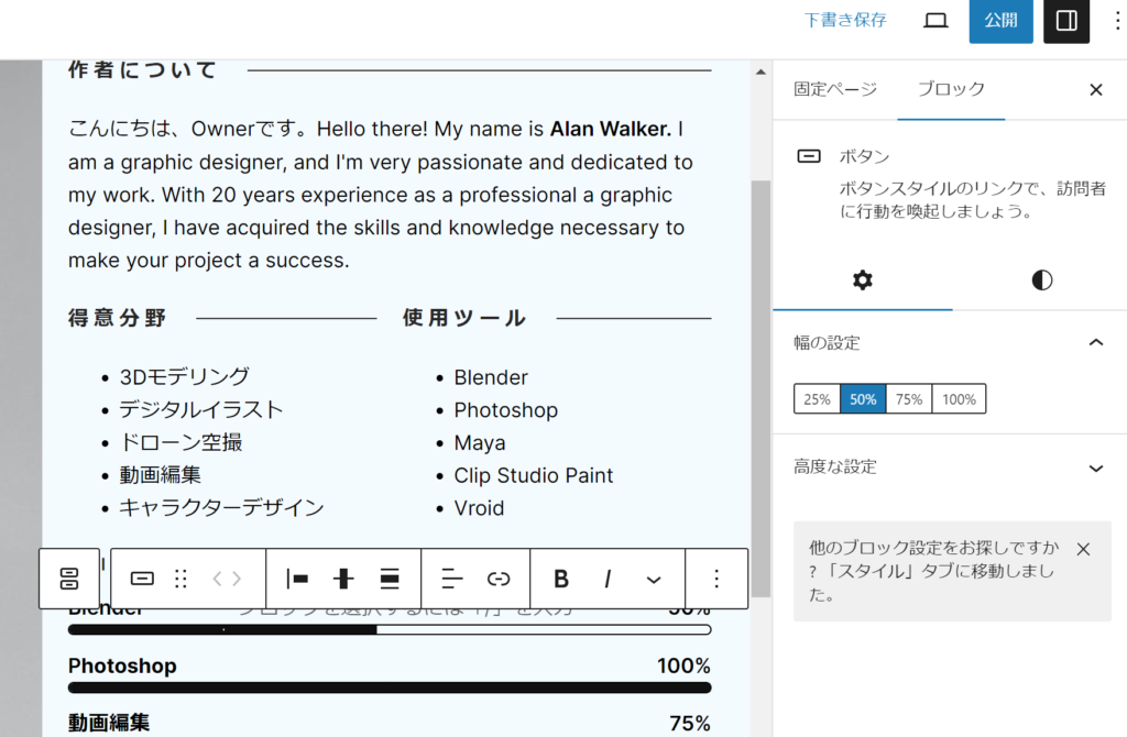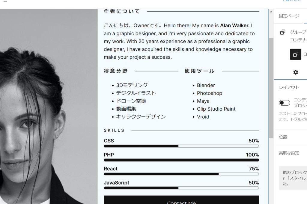 ポートフォリオ(ギャラリー)はできたので、次は自己紹介ページを作りましょう。自分の経歴、受賞歴、スキルなど、自分について知ってもらいたいことを掲載すると良いでしょう。