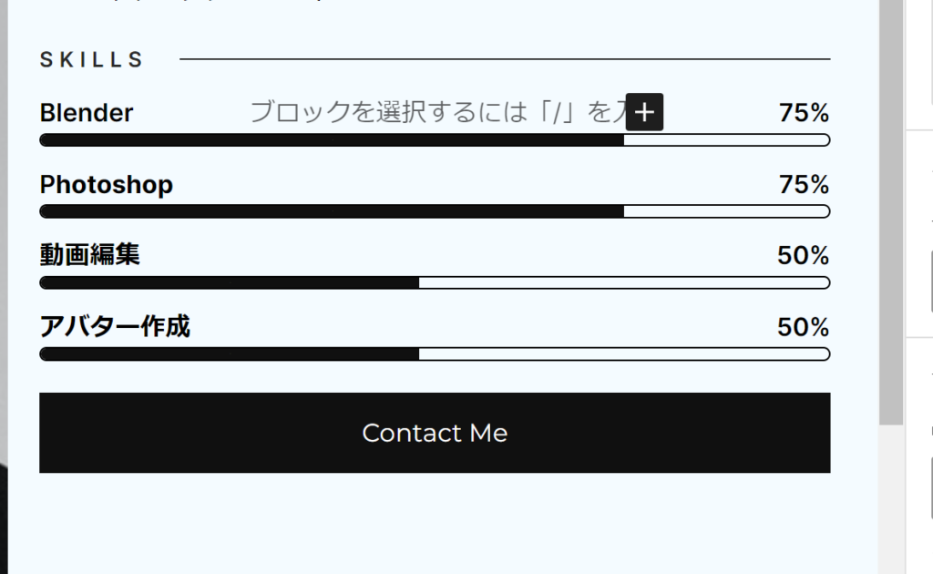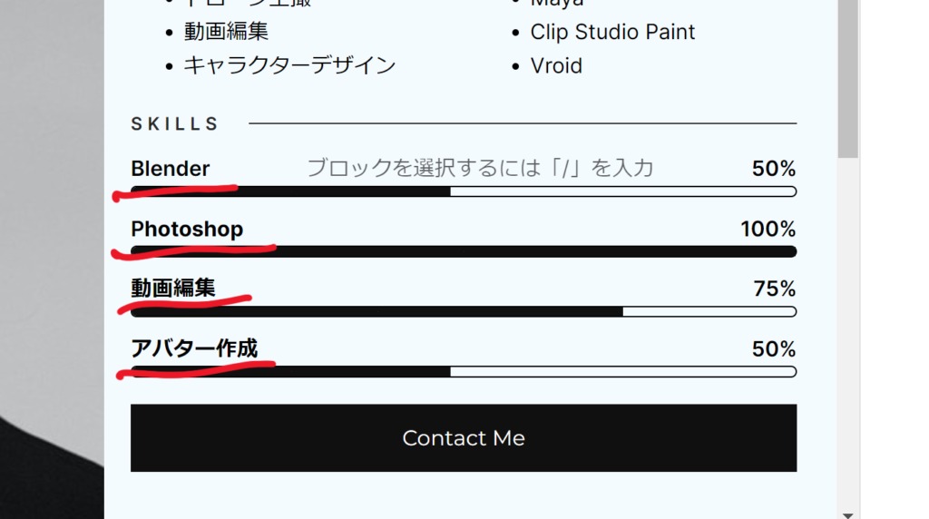 スキルバーの下には「Contact Me」というお問い合わせへのボタンがあります。このボタンを押したら以前に作成したメールフォームのページに移動するように設定していきましょう。