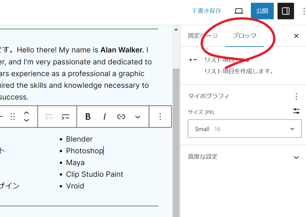 すると、選んだブロックパターンが本文部分に張り付けられるので、あとはいつものように差し替え作業をおこなっていきます。必ずしも同じ内容でなくてもいいです。例えば、「興味のあること」欄を「使用ツール」欄として使ってしまってもOK。