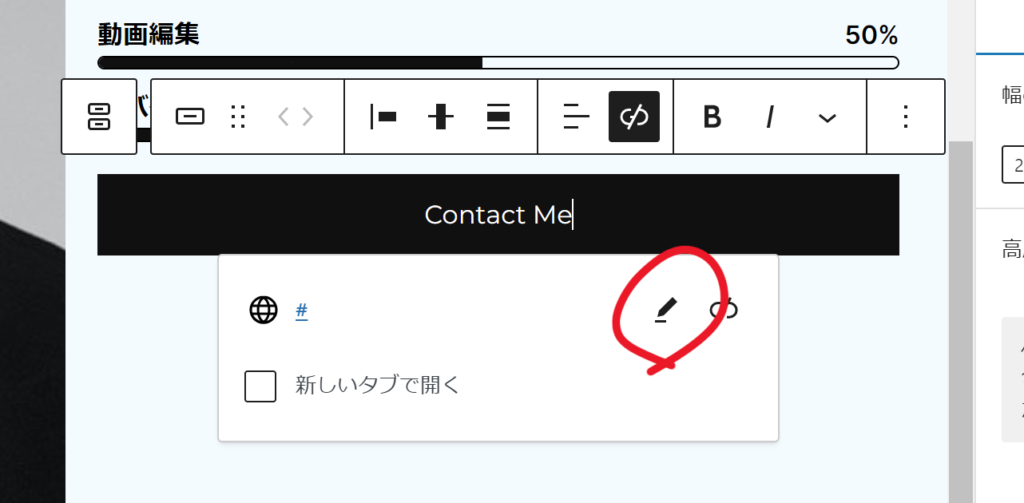 ボタンをクリックして選択します。デフォルトでは#にリンクされているので、地球儀マークに#と書かれた表示が現れます。ここの鉛筆ボタンをクリックしてリンク先URLを編集します。