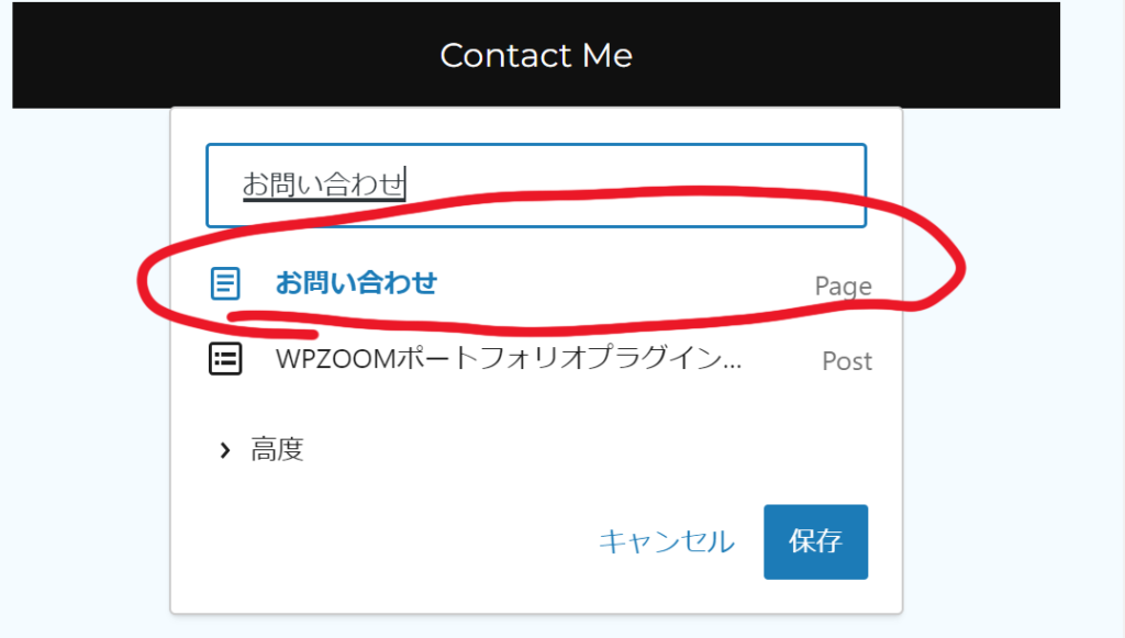 編集用のテキストボックスに「#」と入っているのを削除します。そして、お問い合わせフォームにした固定ページの名前(私の場合は「お問い合わせ」)を入力します。検索結果にお問い合わせフォームのページが表示されたらそれをクリックします。(右端にpageと表示されるのは固定ページ、postと表示されるのは投稿)