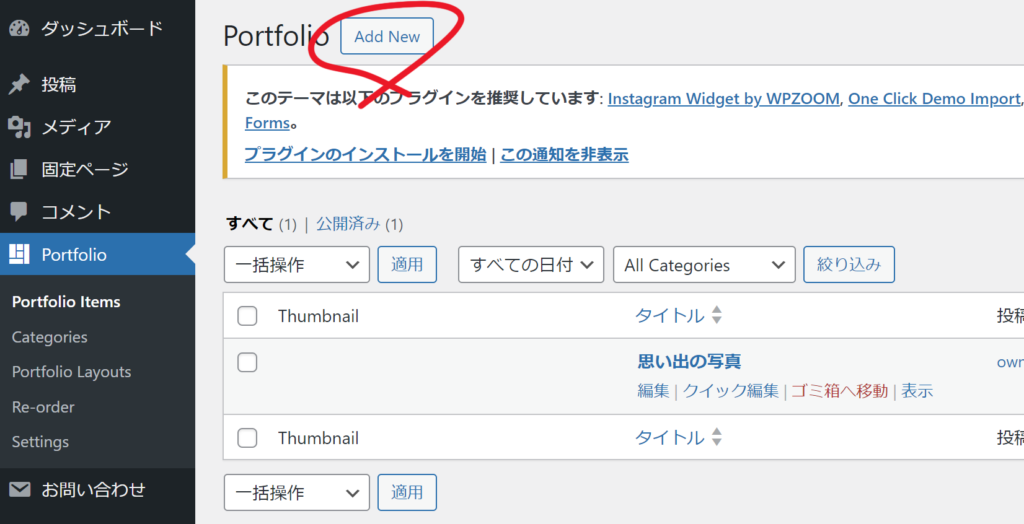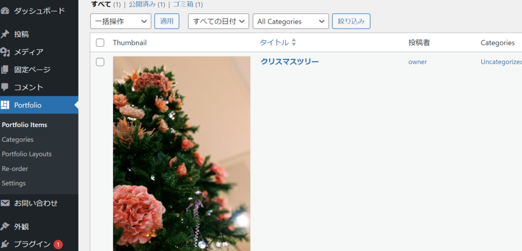 管理画面のPortfolio→Categoriesからも詳細に設定できますが、今回はより簡易に設定してみます。管理画面のPortfolio Itemsに作ったサムネイル記事があります。どれか一つの編集画面を開いてください。