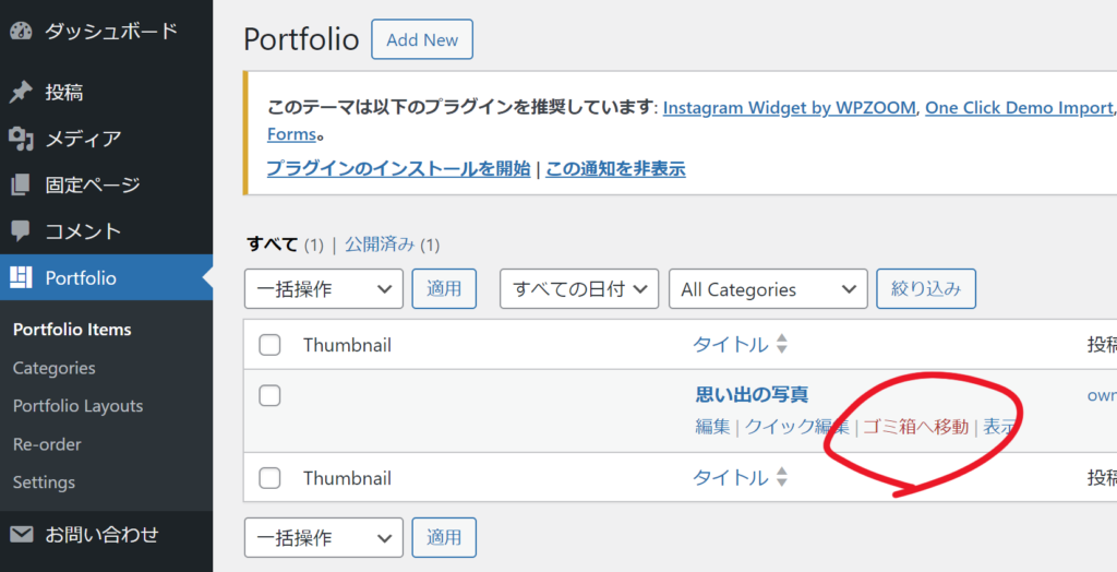 「記事の削除」をしてみましょう。Portfolioで前回ちゃんと表示されなかった記事を削除します。記事にカーソルをのせて、「ゴミ箱へ移動」でさっぱりお別れします。
