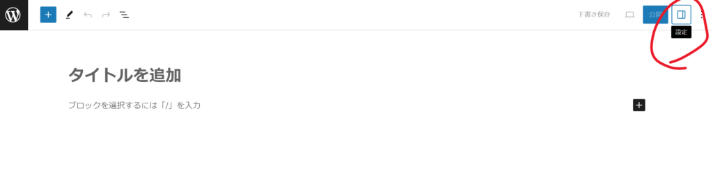 編集画面になったら、右のパネルからアイキャッチ画像にする画像を登録します。記事のタイトルもつけます。もしも編集画面で右パネルが表示されていない場合は、右上の設定アイコンをクリックしてください。右パネルが表示されます。