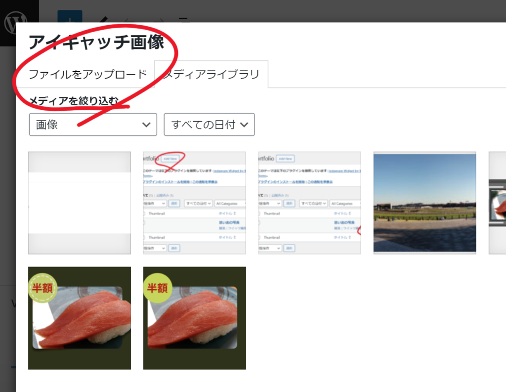 「アイキャッチ画像を設定」という灰色の四角をクリックすると、メディアを選択するウインドウが表示されます。サイトにアップロードする場合は「ファイルをアップロード」を選択してアップロードします。既にアップロード済の画像を使う場合はメディアライブラリの中から選択してください。