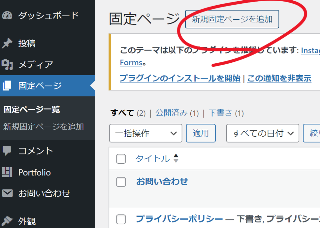 メールお問い合わせページを作った時と同じような感覚でポートフォリオ用のページを用意します。今回も固定ページで作ってみましょう。