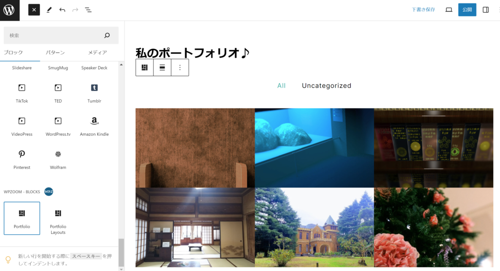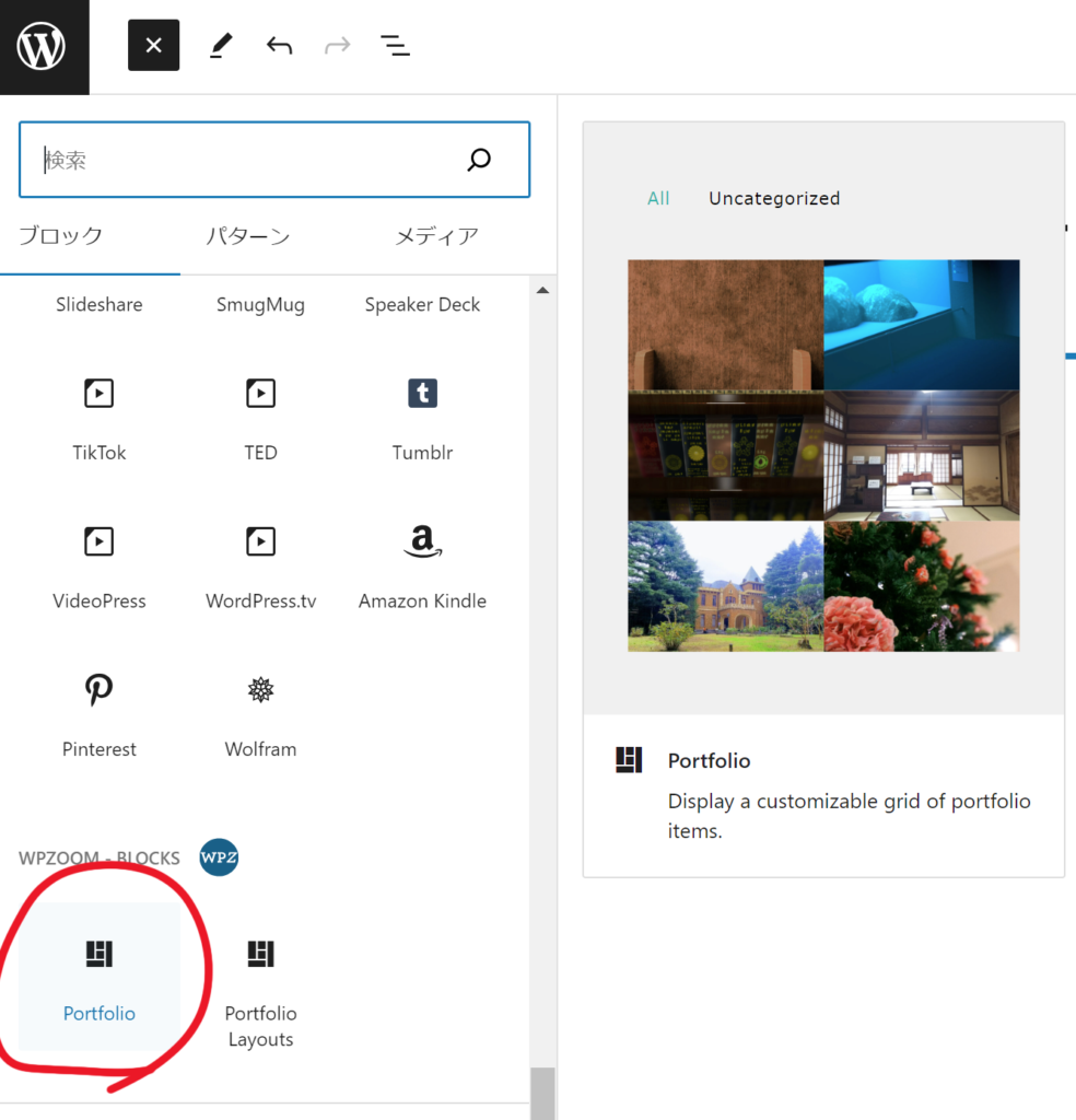 本文のあたりをクリックしてカーソルが点滅したら、左上の青い+アイコンをクリックします。挿入できるブロックの一覧が表示されます。下の方までスクロールすると、WPZOOMのプラグインによって追加されたブロックのグループが出てきます。このPortfolioにマウスカーソルを乗せると、サムネイルに登録した画像の一覧がポップアップします。いい感じになりそうですね。