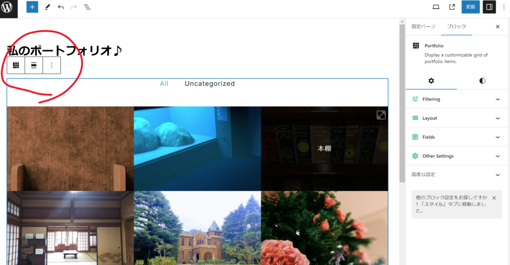 それでは、ポートフォリオページの編集画面を開きます。一覧画像のあたりをクリックすると青い枠が表示されます。Portfolioブロックが選択された状態です。画面のどこかにこのブロックのオプションメニューが表示されます。