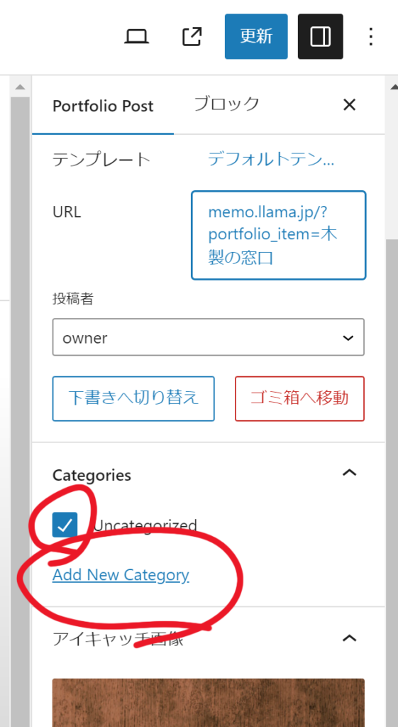 右パネルにCategoriesというセクションがあります。Uncategorizedにチェックが入ってる状態です。