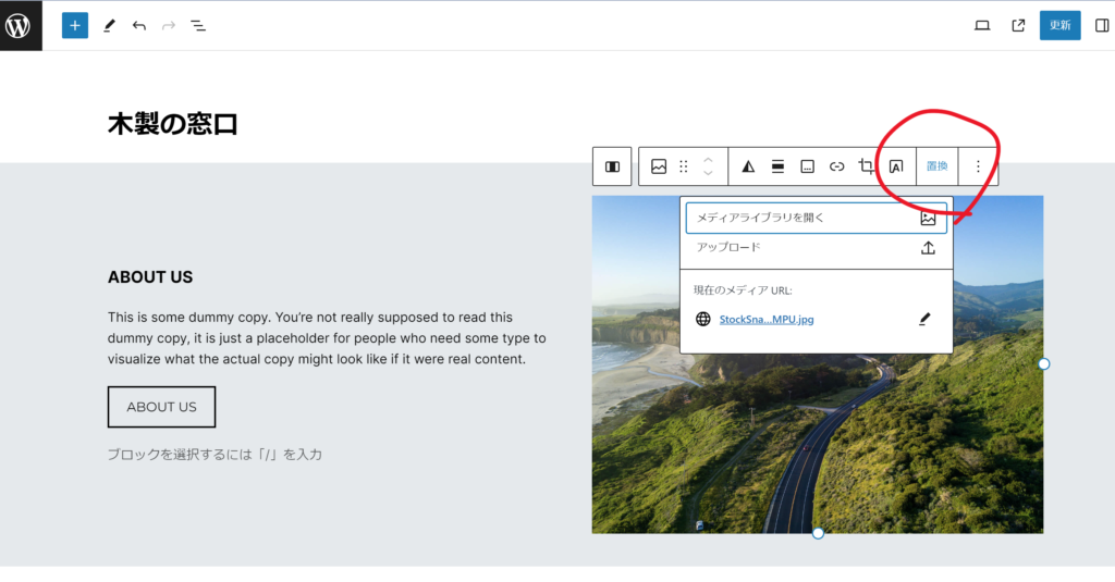 パターンは複数のブロックを組み合わせてできています。編集したい部分をクリックするとその部分のブロックが選択されるので、編集や画像の差し替えなどを行ってください。例えば上の画像は、写真部分をクリックして画像ブロックを選択し、「置換」で画像を変更している様子です。