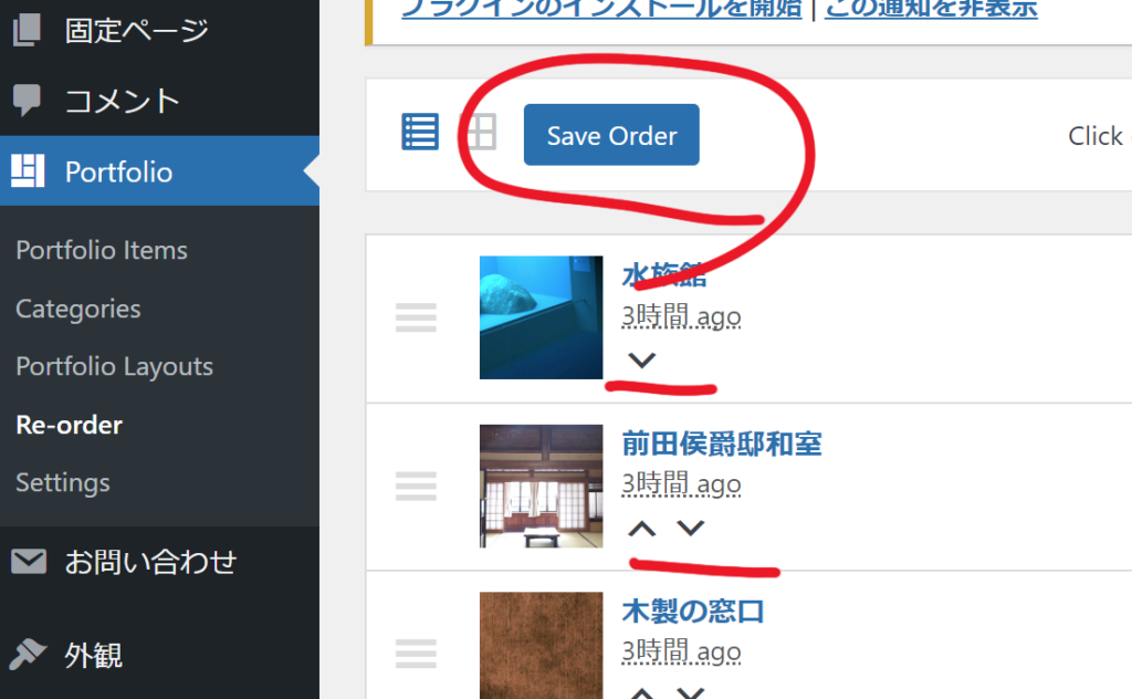 管理画面の「Portfolio」から「Re-Order」を選びます。各項目の上下矢印アイコンで順番を変更できます。変更したあとはSave Orderボタンで保存してください。
